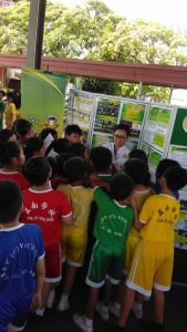 Murid-murid melawat ke pameran di tapak gelanggang bola keranjang