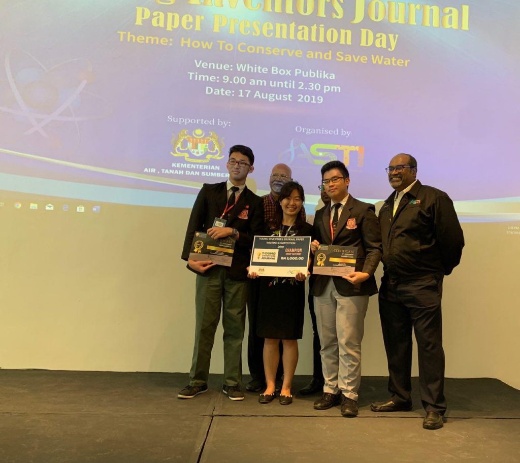 A ceremony was held at White Box, Publika Solaris Dutamas on the 17th of August, 2019 to determine the second runner-ups, first runner-ups and champions from the three selected journal papers in each category. The journal paper from SM All Saints (the one and only team representing the state of Sabah), presented by Danial Lau and Jeriel Yong, supervised by Madam Susan Chin, with the title ‘Applications of Permeable Pavement’ was announced as the Champion of the Group Category. They were awarded winning certificates and a cash prize of RM3000.
