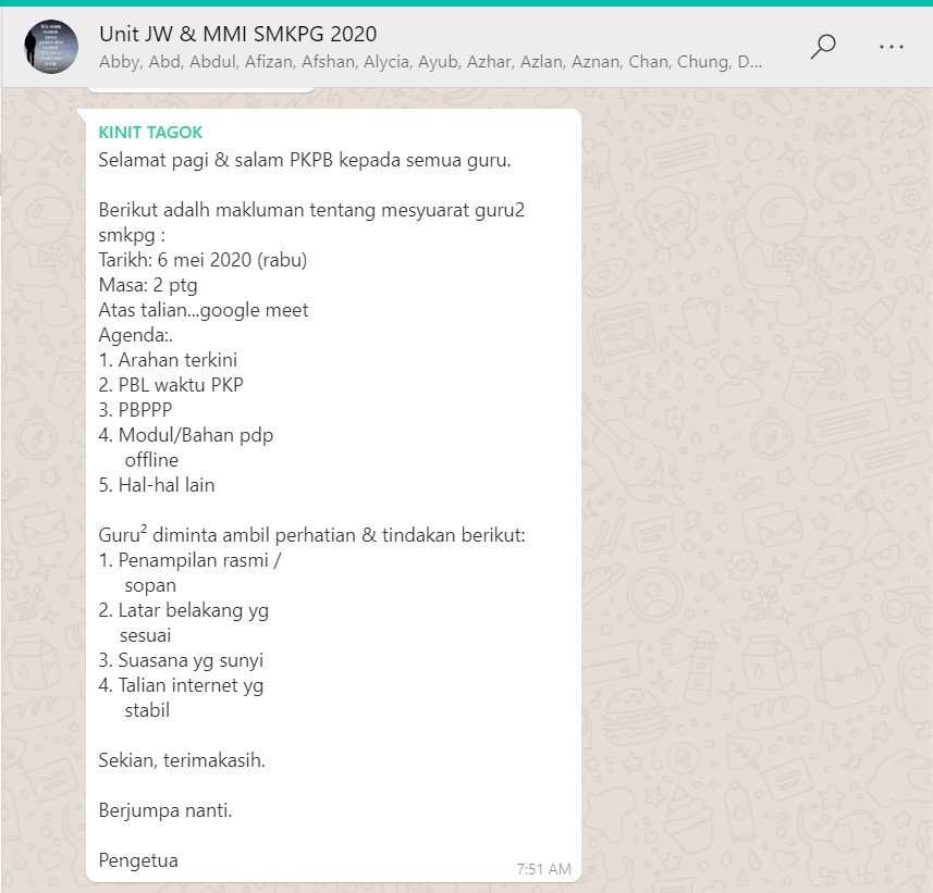 Pada 6 Mei 2020, Jam 2.00 petang Mesyuarat Guru SMK Pulau Gaya secara Maya dengan media Google Meet telah berlangsung. Mesyuarat secara maya digunakan kerana arahan Perintah Kawalan Pergerakan (PKP) bagi seluruh negara akibat wabak Covid19 yang melanda negara dan dunia. Mesyuarat secara maya yang pertama melibatkan semua Guru-guru SMK Pulau Gaya telah di pengerusikan oleh puan Kinit Tagok, Pengetua SMK Pulau Gaya.