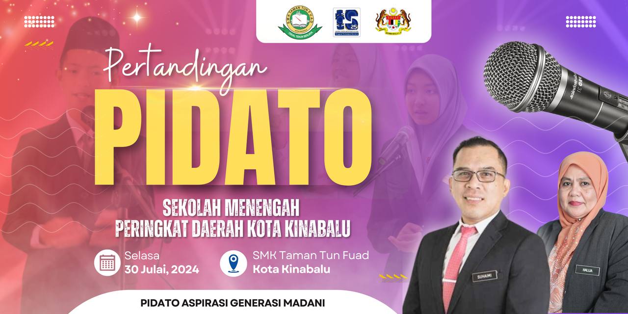 30 Julai 2024 –Pertandingan Pidato Aspirasi Generasi Madani Sekolah Menengah Daerah Kota Kinabalu Tahun 2024 telah dijalankan di mana SMK Taman Tun Fuad telah dipilih sebagai tuan rumah pada tahun ini. Antara objektif program ini dijalankan ialah untuk mencungkil bakat dan kreativiti murid berpidato secara bersahaja dan meyakinkan, menggalakkan murid membaca dan menghayati karya ilmiah penulis tempatan dan luar Negara, membina keyakinan diri dan semangat juang yang tinggi serta berdaya saing dalam kalangan murid, meningkatkan kemahiran berbahasa iaitu mendengar, bertutur, membaca dan menulis dan membudayakan pengurusan KBAT dalam kalangan AJK pengelola.