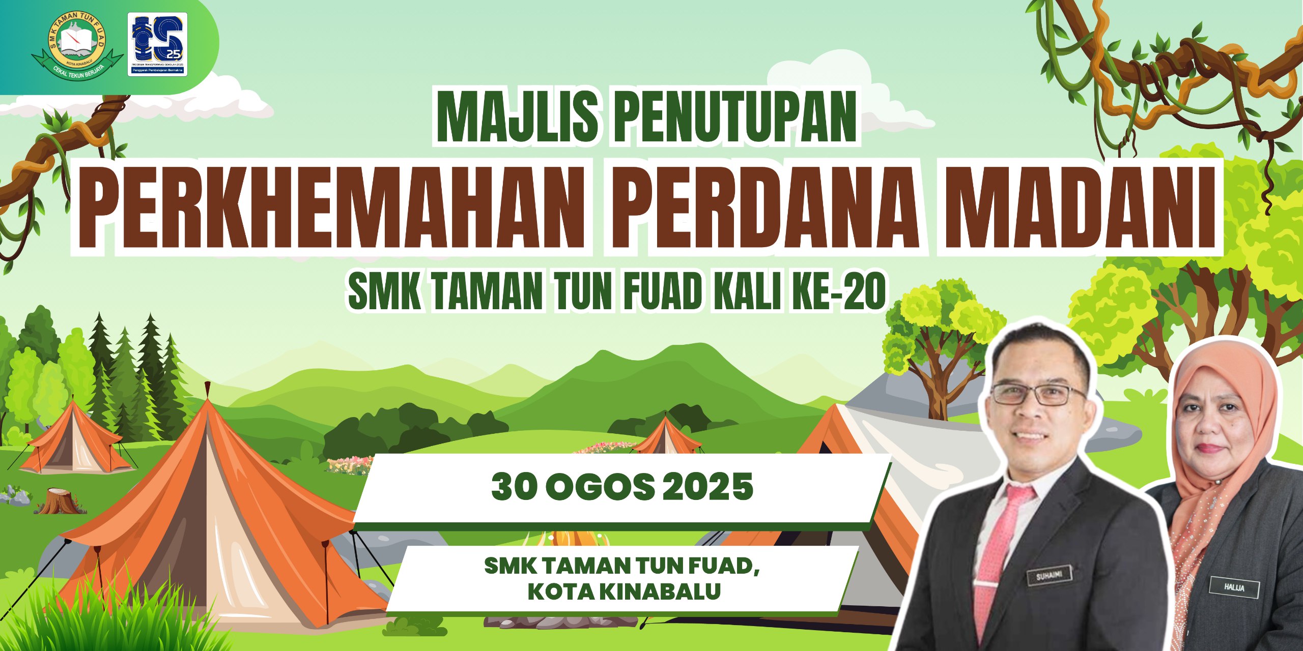 30 Ogos 2025 – Majlis penutupan Perkhemahan Perdana MADANI Unit Beruniform Kali Ke-20 SMK Taman Tun Fuad Tahun 2025 anjuran unit Kokurikulum SMK Taman Tun Fuad telah disempurnakan oleh Encik Azlan Mohd Zainal Harbir Abdullah, Penolong Pegawai Pendidikan Daerah Kota Kinabalu. Perkhemahan ini merupakan salah satu agenda tahunan sekolah yang paling utama. Program ini dijalankan sebagai salah satu inisiatif pihak sekolah untuk menyahut seruan Pelan Pembangunan Pendidikan Malaysia (PPPM) 2013-2025. Perkhemahan Perdana MADANI Unit Beruniform Kali Ke-20. Program ini menyediakan platform bagi 10 unit beruniform di SMK Taman Tun Fuad untuk menimba pengalaman melalui pembelajaran di luar bilik darjah selama dua hari satu malam (29-30 Ogos 2025). Peserta-peserta perkhemahan akan dapat berkongsi pengetahuan dan kemahiran, bertukar-tukar idea dan pengalaman, membina keyakinan diri, serta menjalinkan hubungan kerjasama yang erat melalui aktiviti-aktiviti mencabar yang akan dijalankan dalam perkhemahan ini. Harapan pihak sekolah agar perkhemahan ini dapat melahirkan murid yang seimbang dari segi jasmani, emosi, rohani, dan intelek (JERI), seiring dengan pernyataan Falsafah Pendidikan Negara, serta misi sekolah yang berbunyi “Memberi Pendidikan Berkualiti Secara Bersepadu bagi Melahirkan Modal Insan Cemerlang Berlandaskan Misi Nasional”. Antara aktiviti perkhemahan ini ialah aktiviti kerohanian, senaman pagi, Kembara Minda / Jungle Treking, Aktiviti Lasak / Merempuh Halangan, Zipline, persembahan kebudayaan dan gotong-royong. Keputusan pertandingan dalam perkhemahan ini adalah seperti berikut: bagi aktiviti Malam Kebudayaan, Johan : Persatuan Pandu Puteri Malaysia, Naib Johan : Kadet Jabatan Pengangkutan Jalan (JPJ) manakala Tempat Ketiga: St John Ambulans dan Bulan Sabit Merah Malaysia. Tambahan pula, bagi kategori Peserta Terbaik Lelaki adalah dimenangi oleh RICKCLAYREYSON RATIBON (Kadet JPJ) manakala Peserta Terbaik Perempuan dimenangi oleh EPHDELLIA WINETTE WALTON (Pandu Puteri). Akhirnya, bagi kategori Pasukan Terbaik ialah Platun 10.